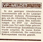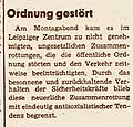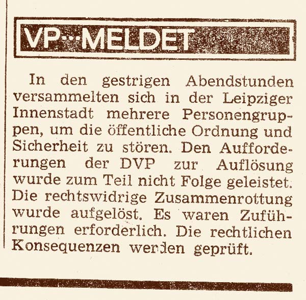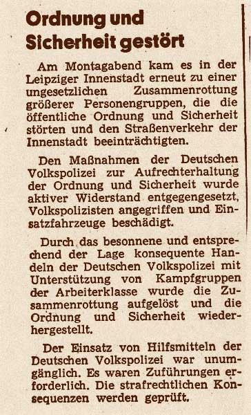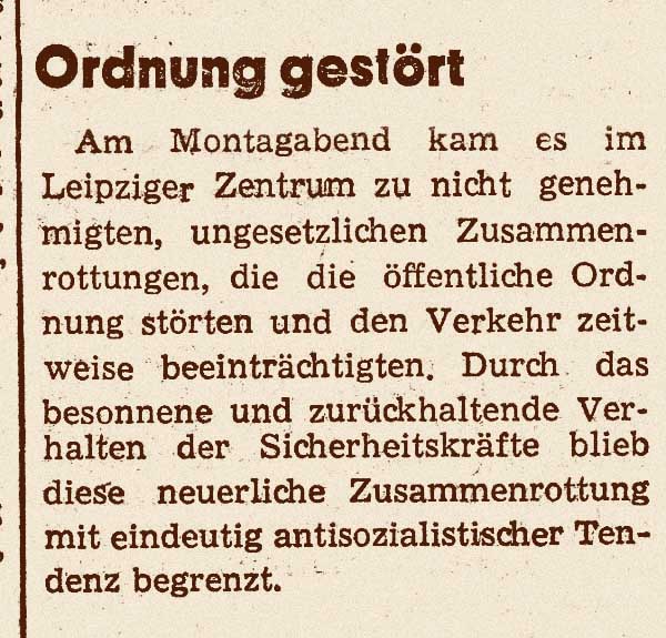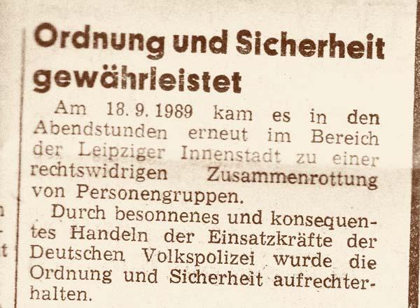 Ungarn öffnet am 11.September seine Grenzen zu Österreich für DDR-Bürger. Am gleichen Tag riegelten Polizeiketten das Gebiet um die Nikolaikirche während des Gottesdienstes ab. Es werden knapp 100 Personen nach dem Friedensgebet festgenommen. Die Verurteilung erfolgt in der Manier von Standgerichten ohne Gerichtsverfahren. Die Berichterstattung in der Presse erfolgt im üblichen SED-Jargon( links die Meldung vom 12.September in der Leipziger Volkszeitung).