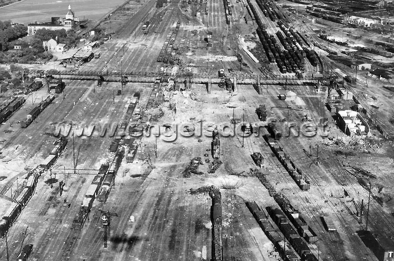Das Bild zeigt den zerstörten Güterbahnhof zwischen Güterbahnhofstraße und RAW, es wurde am 11.April 1945 von der Royal Air Force gemacht. Links oben ist noch das Kohlensäurewerk mit seinen markanten Turm zu erkennen.