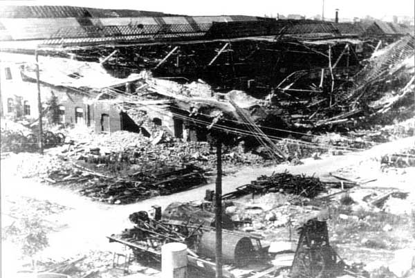 Am 10.April 1945 wurde das Werk durch alliierte Bomber zu 85% zerstört. Die Lokwerkstatt, die Wagenwerkstatt, die Kantine, die Lehrwerkstatt sowie die Außenanlagen waren nicht mehr wieder zu erkennen. Die Nazi-Diktatur wurde besiegt, doch ihre Folgen waren verheerend. Deutschland hatte den schrecklichsten Krieg des 20.Jahrhunderts verloren. Die durch direkte Kriegseinwirkungen Getöteten werden auf 56 Millionen Menschen geschätzt.